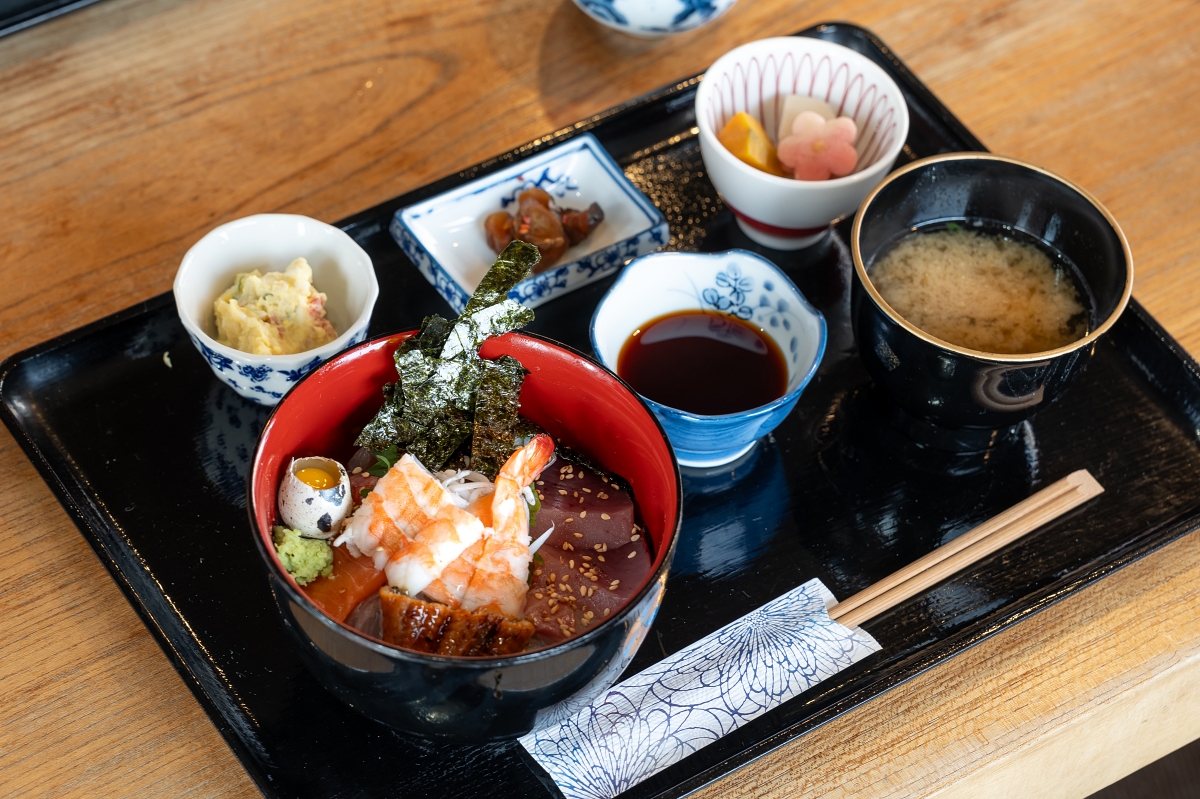 當天中午我點了海鮮丼飯,老闆實在太老實了,擺盤都藏太多了,外表拍起來超級樸實,看起來好像沒什麼料,沒想到居然有小型黑鮪魚(ヨコワ)、鯛魚、鮭魚、紅魽、熟蝦、鰻魚、魩仔魚、生鵪鶉蛋等等,味道都非常新鮮美味,最特別的就是第一次吃生鵪鶉蛋感覺很新奇,蛋黃味道滿濃郁的,很神奇的感受!