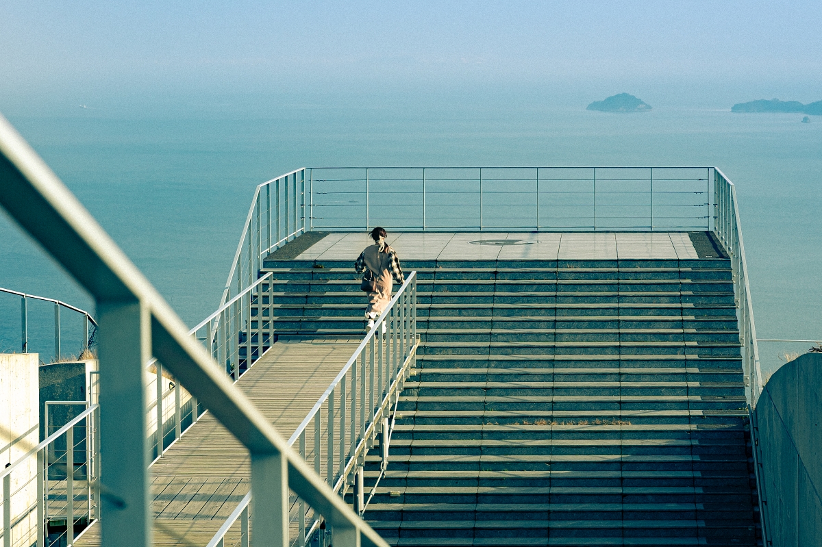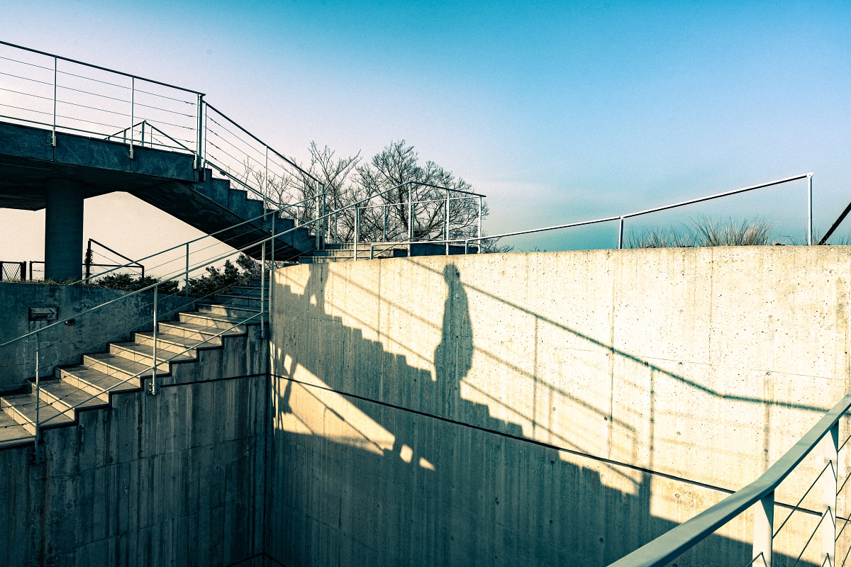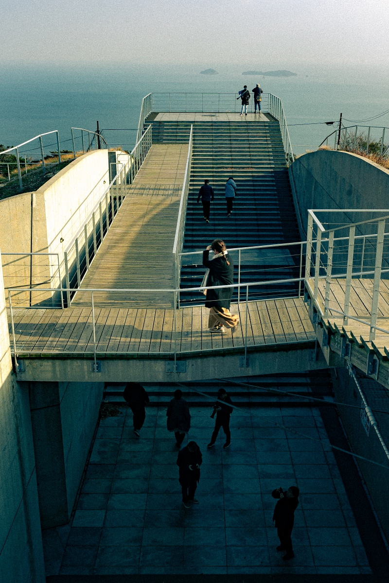 龜老山展望公園這裡超適合大大玩調色一下!初來乍到龜老山展望台會有種新手小白在空間迷失的迷路感,好像到建築大師隈研吾設計的場館中,滿容易遇到了,所以我觀察人群時,發現一瞬間大大可以符合我剛剛的感受,將地下第一層的旅客調為冷調藍色,表現出剛進入的迷茫感,抵達展望看台則呈現溫暖的橙色,表達出抵達目標正在享受美景的感覺,加上通道往來的旅客,看起來照片更生動起來,最後將照片顆粒加粗,呈現底片感。