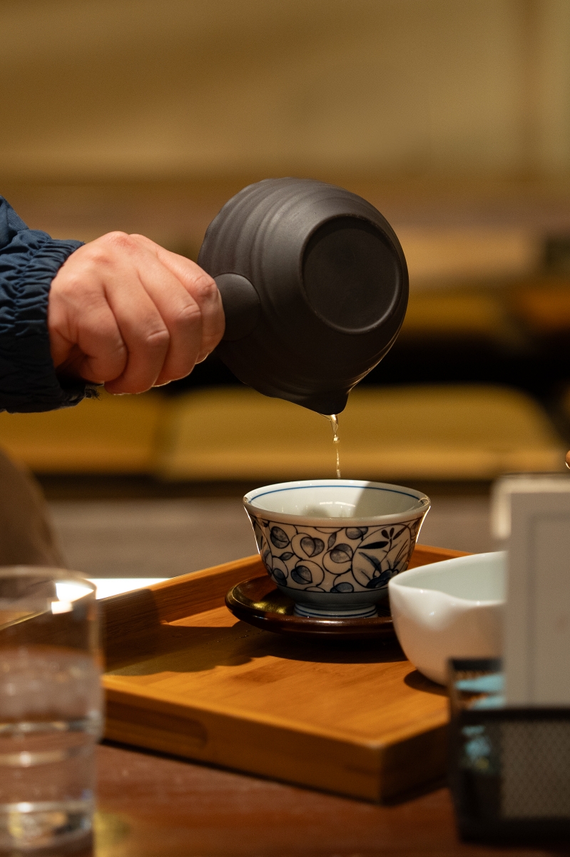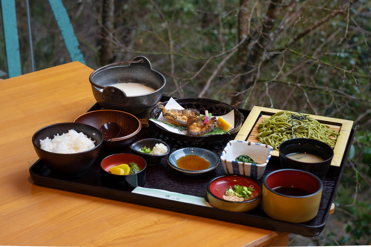 餐廳中午時段提供各式套餐,最熱門的餐點就是有新宮茶蕎麥麵、朧豆腐與炸香魚的套餐,在這裡可以品嚐到使用新宮茶製作的蕎麥麵,朧豆腐作法相當雅緻,只使用一點凝固用的鹽滷,據說為了保持豆腐朦朧感,說到這裡日本對美食型態與描述真的很講究,香魚一般都是用烤的,用炸的香魚第一次吃到覺得也滿好吃的,尤其體型比較飽滿的香魚,吃起來肉質比較豐厚,咬起來還會卡滋卡滋的。