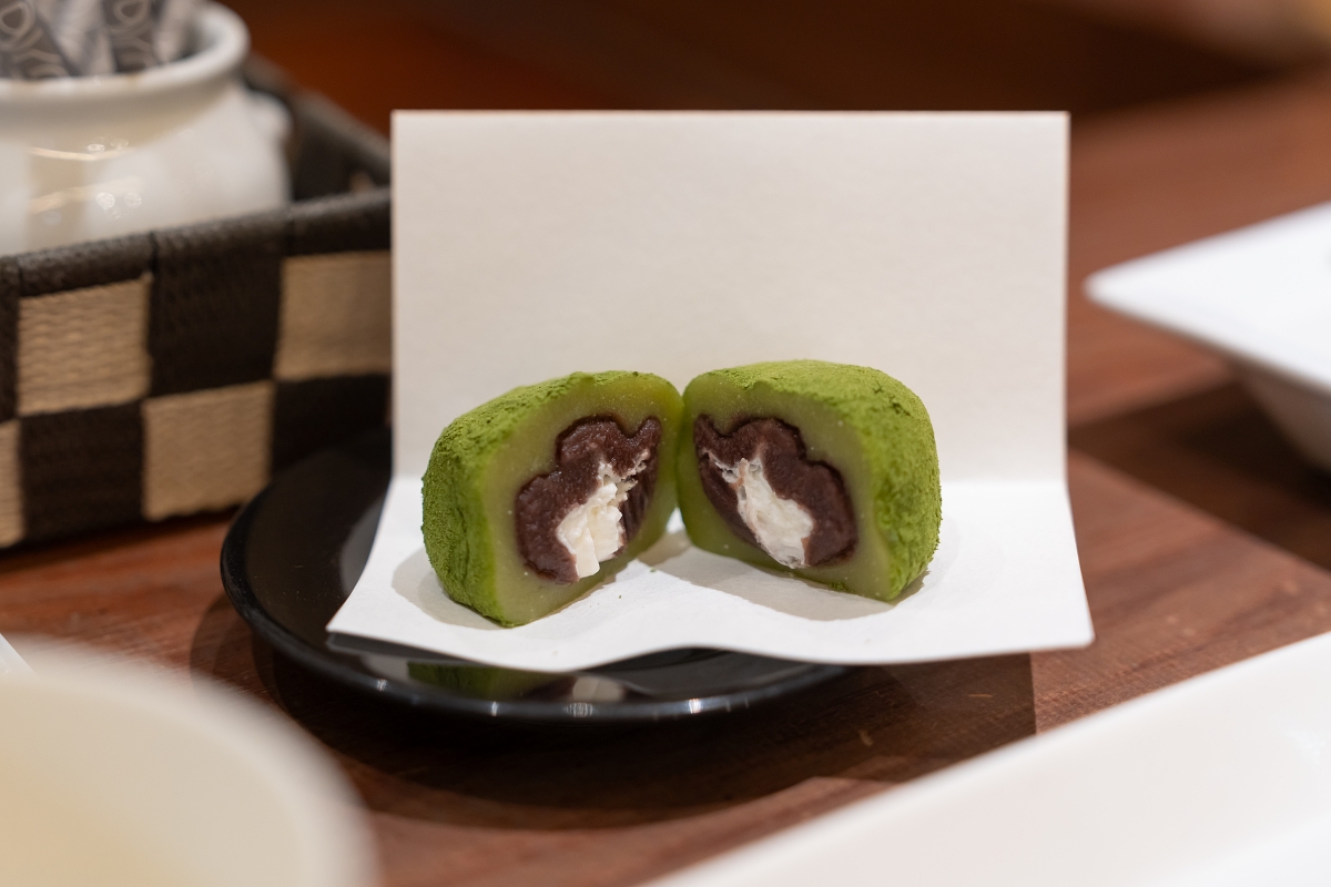 來霧之森道路休息站一定要點明星商品霧之森大福,鮮奶油、紅豆泥包入麻糬內,再裹上新宮茶粉,會先感受到茶香與優雅的苦味,充分咀嚼後,甜而不膩的紅豆內餡與滑嫩的鮮奶油會蹦出來,口感相當獨特又好吃的大福。霧之森大福現在在松山城纜車商店街上的分店也買得到,但據說很快就賣完了,來霧之森休息站買反而比較容易買到喔!