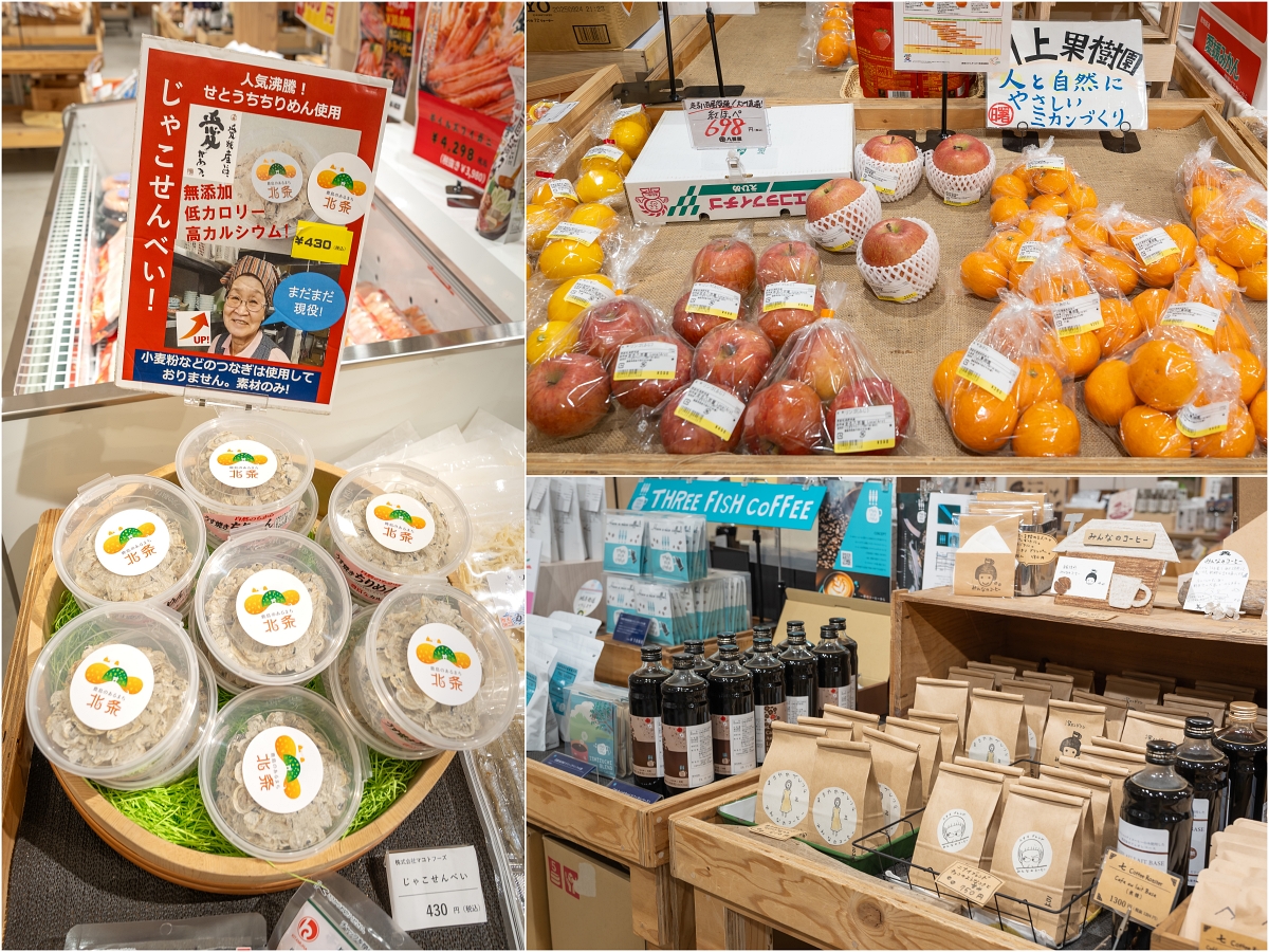 「itomachi marche」內有許多外面少見的愛媛產品,像上圖左邊的白身小雜魚乾,單純將鯛魚科小雜魚直接做成超級薄片,吃起來香香的,咬起來帶點脆脆完全不需要費力咬斷,還有當地農特產品,仔細逛的話也是要花不少時間呢!